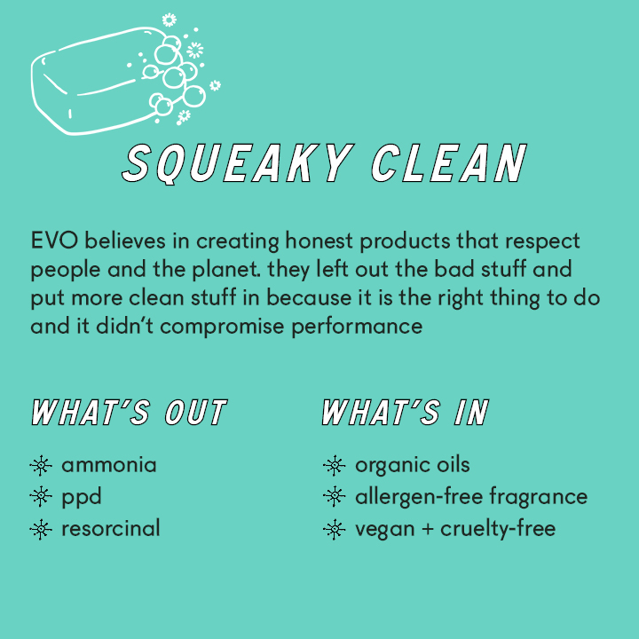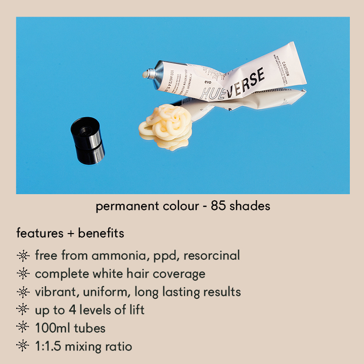 EVO confidently claims hue-verse as the industry’s cleanest colour line. By combining ammonia-free, an allergen-free fragrance, and a plethora of ‘squeaky’ clean vegan plant-based ingredients, both clients and stylists enjoy reduced scalp/skin sensitivity and irritation. Importantly, harmful chemicals like silicones, sulfates, parabens, and mineral oils are all out. In their place are organic avocado oil, organic yellow chamomile, and plant-derived glycerin. The result? A vegan and cruelty-free solution that respects both hair health and the environment.
